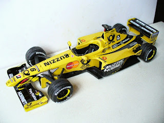 Mais um Fórmula 1 "fora de escala" montado, Jordan EJ10 pilotado por Jarno Trulli em 2000, fraco kit da Revell na escala 1/24. The team of the Irishman Eddie Jordan finished 1999 the most successful season of their nine years career to date in Formula 1. Heinz-Harald Frentzen, who had already raced for Jordan in Formula 3000, demonstrated his qualities as a driver by taking Grand Prix victories in Monza and Magny Cours with a total of 54 points. The success of the runner-up to the 1997 World Champion in 1997 earned grat respect and popularity with the public for him, for the team who with 61 points ranked 3 in the constructors’ listings and finally earned the sponsorship of the Deutsche Post for Jordan. In addition the V10 engine prepared by the Honda subsidiary Mugen always gave good and reliable service. Starting from these beginnings Jordan entered the 2000 season with high expectations, which nevertheless were not realised as planned. 3rd and 4th places in Brazil were followed by races in which technical shortcomings several times prevented them from finishing. The promising second driver and successor to Damon Hill, Jarno Trulli, was able to gain points in Canada and France, and Frentzen also was placed third in Indianapolis, but problems, in particular with the new gearbox held the Jordan Team back in 6th place. Only the skills of the drivers prevented an even worse performance, to give Frantzen a passable 9th ranking followed by Trulli with 6 points. Revell kit at 1/24th scale.